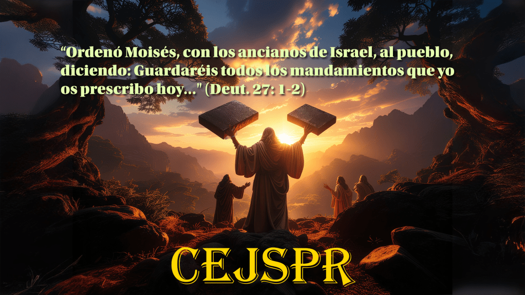 “Ordenó Moisés, con los ancianos de Israel, al pueblo, diciendo: Guardaréis todos los mandamientos que yo os prescribo hoy… Y el dia que pases el Jordán a la tierra que El Eterno tu Dios te da, levantarás piedras grandes, y las revocarás con cal…Y escribirás muy claramente en las piedras todas las palabras decesta ley, Estas son las palabras del pacto que El Eterno mandó a Moisés que celebrase con los hijos de Israel en lactierra de Israel en la tierra de Moab, además del pacto que concertó con ellos en Horeb.” (Deut. 27: 1-2; 28:1)