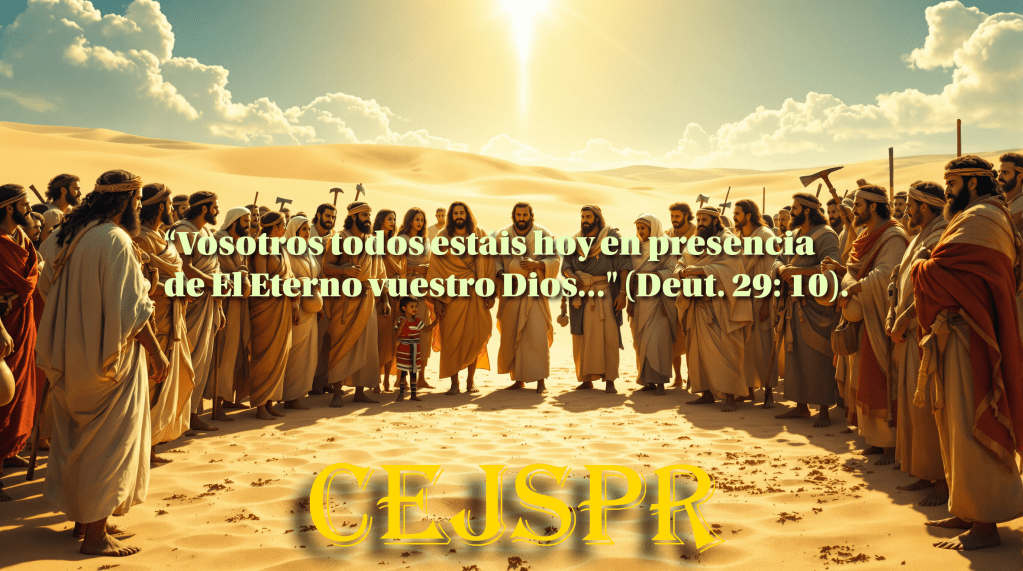 “Vosotros todos estáis hoy en presencia de El Eterno vuestro Dios; las cabezas de vuestras tribus, vuestros ancianos y vuestros oficiales, todos los varones de Israel; vuestros niños, vuestras mujeres, y tus extranjeros que habitan en medio de tu campamento, desde el que corta tu leña hasta el que saca tu agua; para que entres en el pacto de El Eterno tu Dios, y en su juramento, que El Eterno tu Dios concierta hoy contigo para confirmarte hoy como su pueblo…” (Deut. 29: 10-13)